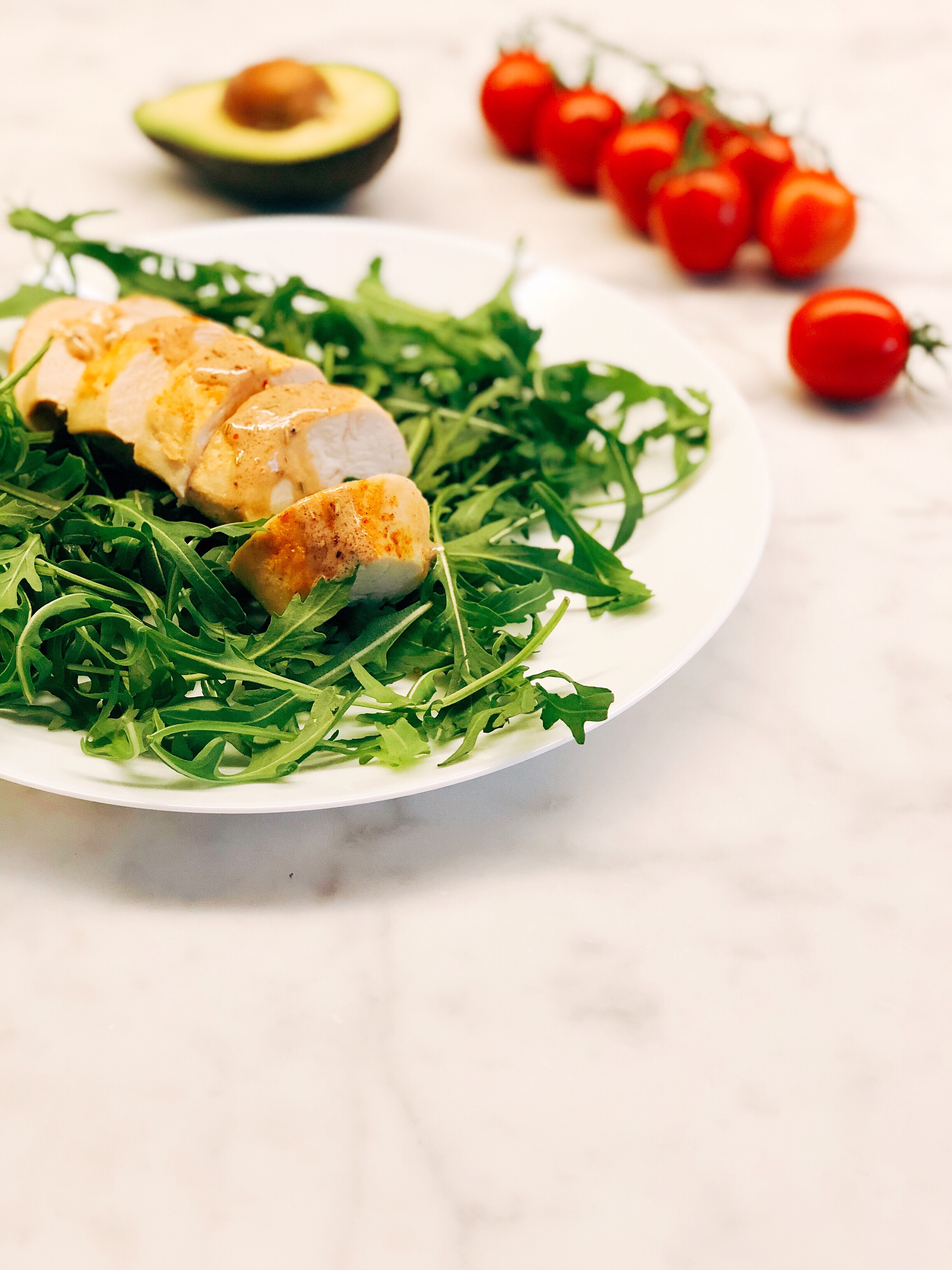 - verdeel de rucola, tomaatjes, avocado en kip over de borden en verdeel er wat van de dressing over.