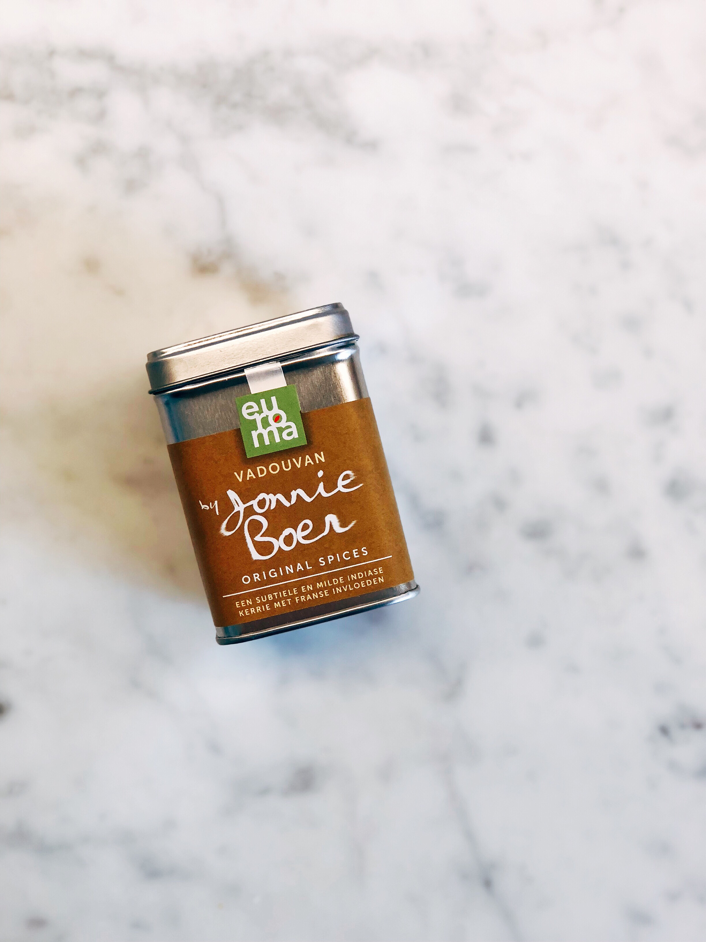 Ik gebruikte de Vadouvan curry kruiden van Jonnie Boer ( te koop in de grotere Albert Heijn winkels ), maar gewoon curry poeder kan natuurlijk ook.