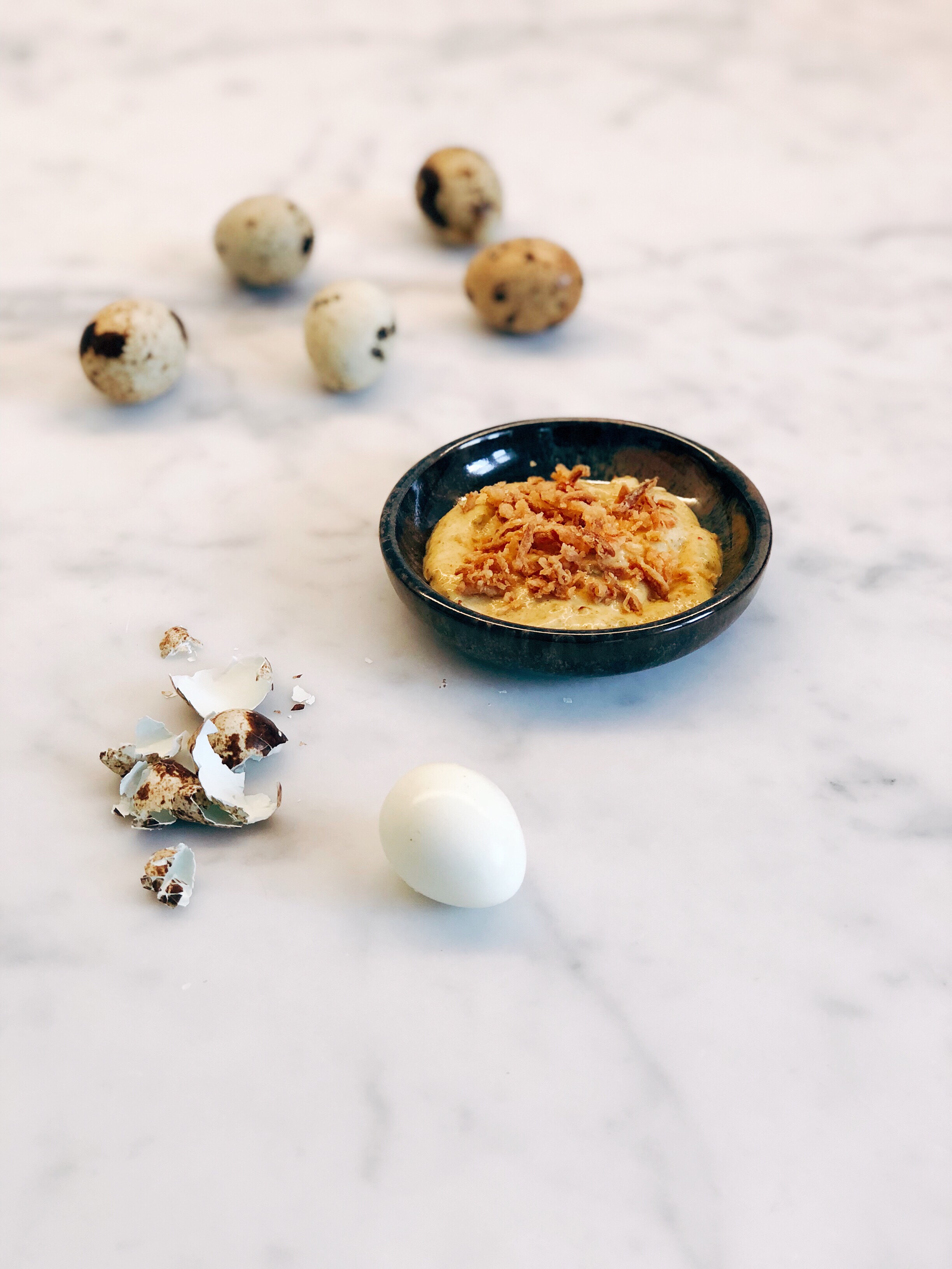 De inspiratie voor dit leuke hapje deed ik op tijdens een etentje in het restaurant ‘Publiek’ in Gent (gastronomisch restaurant met chef Olly Ceulenare, absolute aanrader!) Eén van de amuses die we toen kregen waren een paar kwarteleitjes met een curry-achtige dipsaus.
