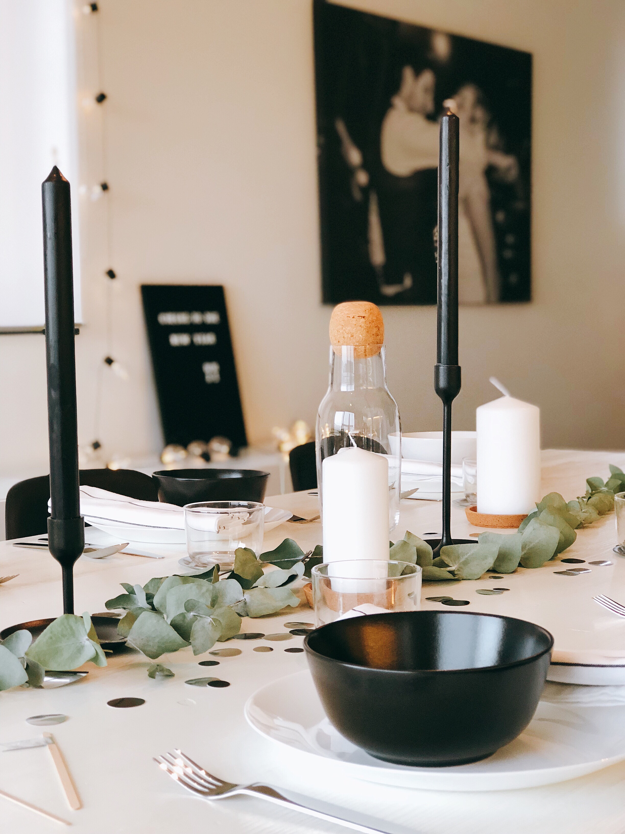 Ik dacht voor oudejaarsavond oorspronkelijk zwarte en gouden tinten te gebruiken, maar deze week kocht ik een nieuwe bestekset in een zilveren kleur, dus het werd zilver en zwart! Want iets nieuw, dat wil je toch altijd zo snel mogelijk gebruiken 😊 (ik toch!)