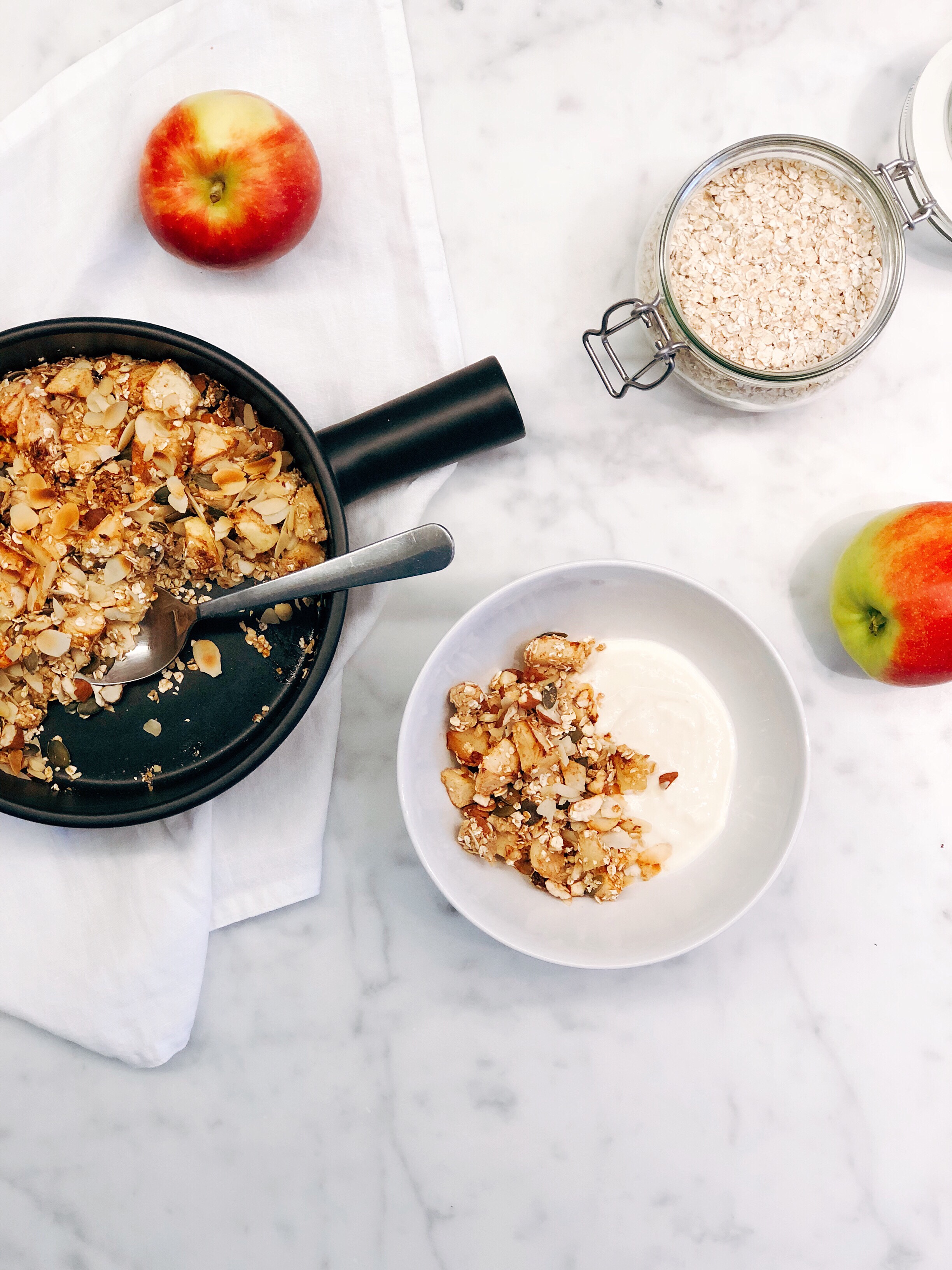 • meng de stukjes appel met de havermout, gehakte noten, pompoenpitten, (gesmolten) kokosolie, honing en kaneel