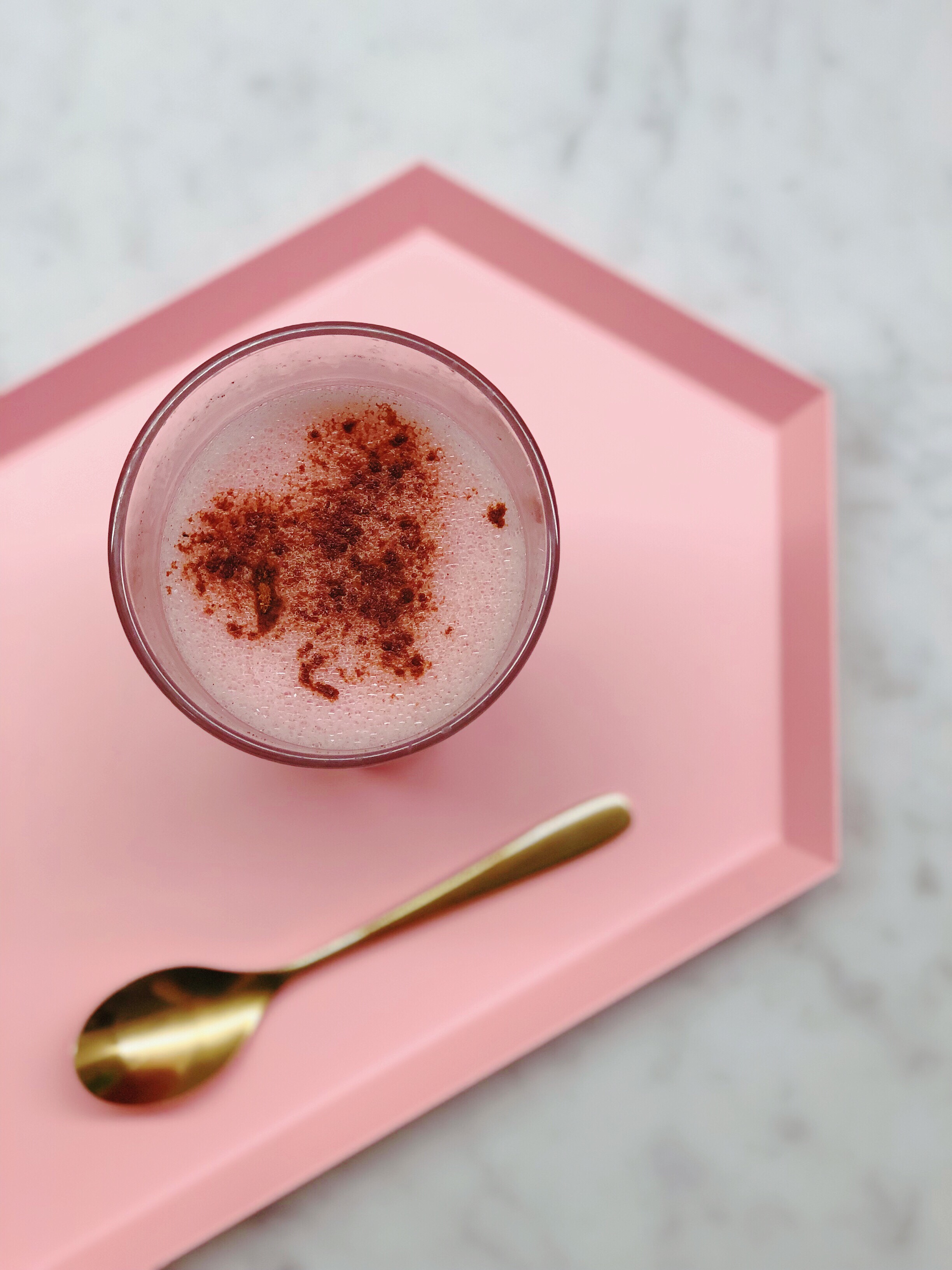 De roze kleur van deze latte komt door de toevoeging van bietensap. Klinkt misschien raar, de combinatie melk en rode biet, maar dit is echt wel heel lekker drankje, en een leuke afwisseling voor dat tasje koffie of thee.