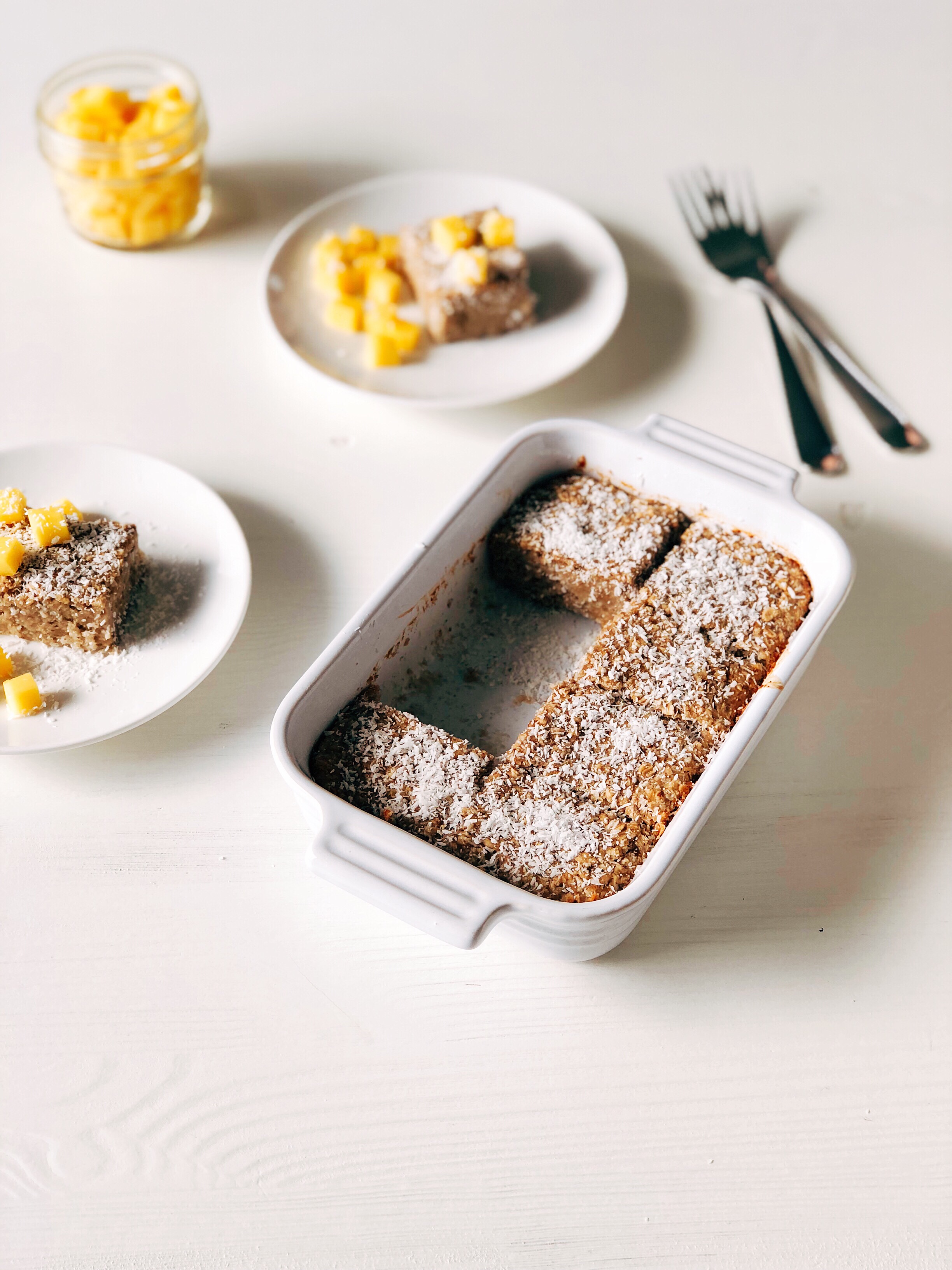 - haal het havermoutgebak uit de oven en laat een beetje afkoelen, strooi er nog wat extra kokosrasp over