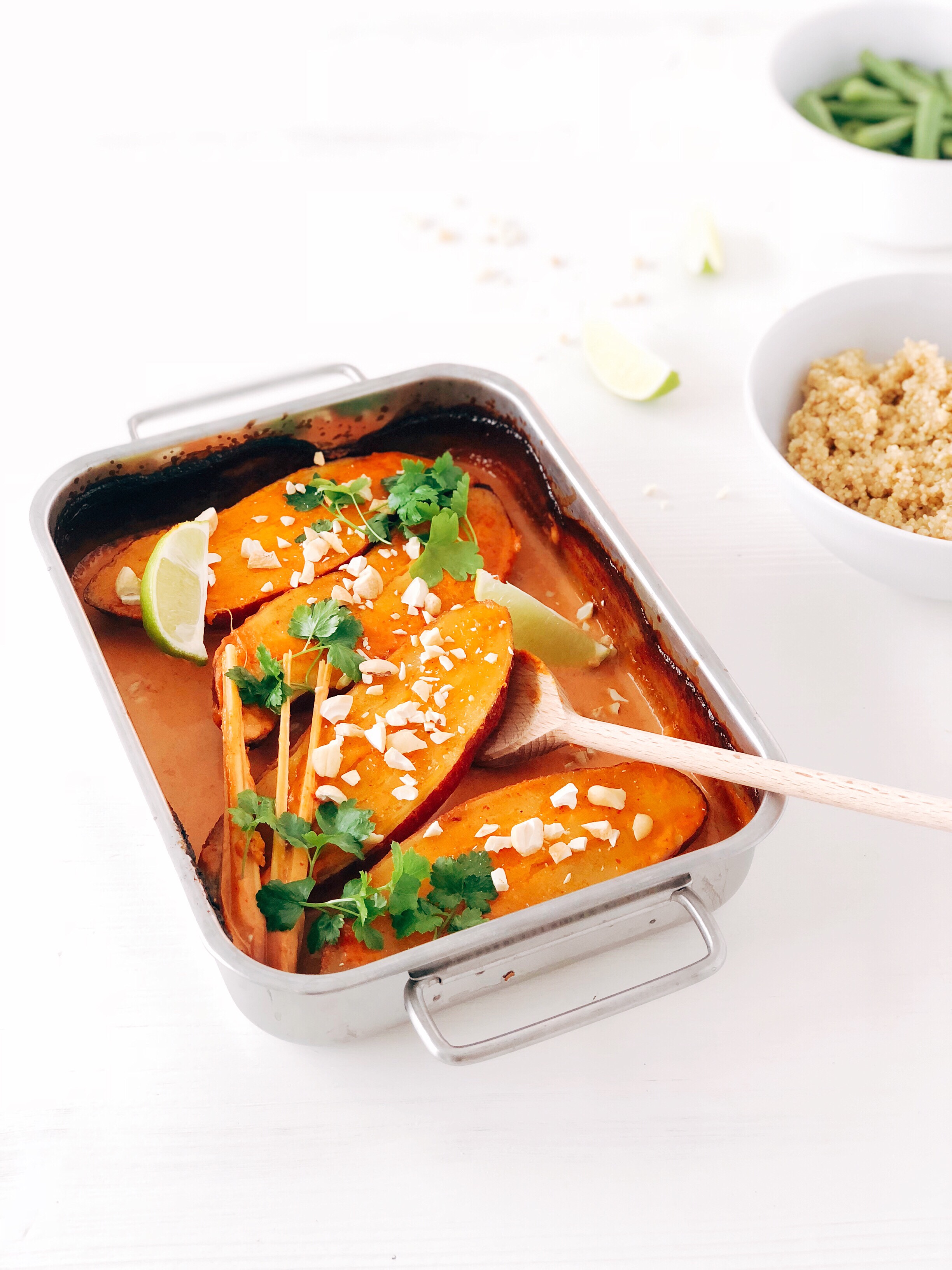 Ik vind deze geroosterde zoete aardappelen het lekkerst met wat quinoa of rijst en gestoomde of gekookte groene groenten zoals princessen- boontjes, broccoli of groene asperges. Wil je er graag een stukje vlees bij? Combineer dan met gebakken kipfilet.