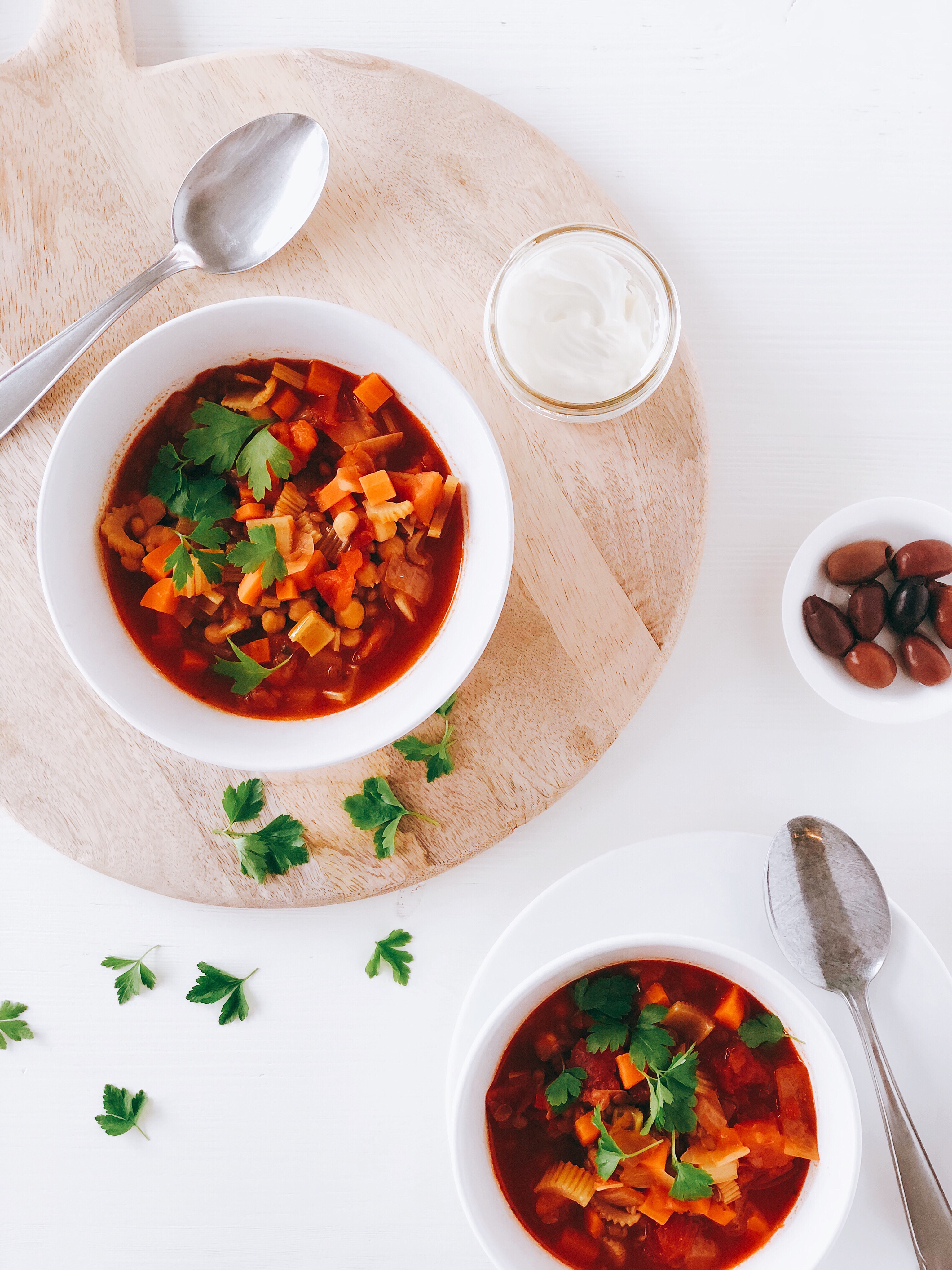 - schep de soep uit in kommen en serveer met een flinke lepel yoghurt en bestrooi met de olijven en koriander of platte peterselie