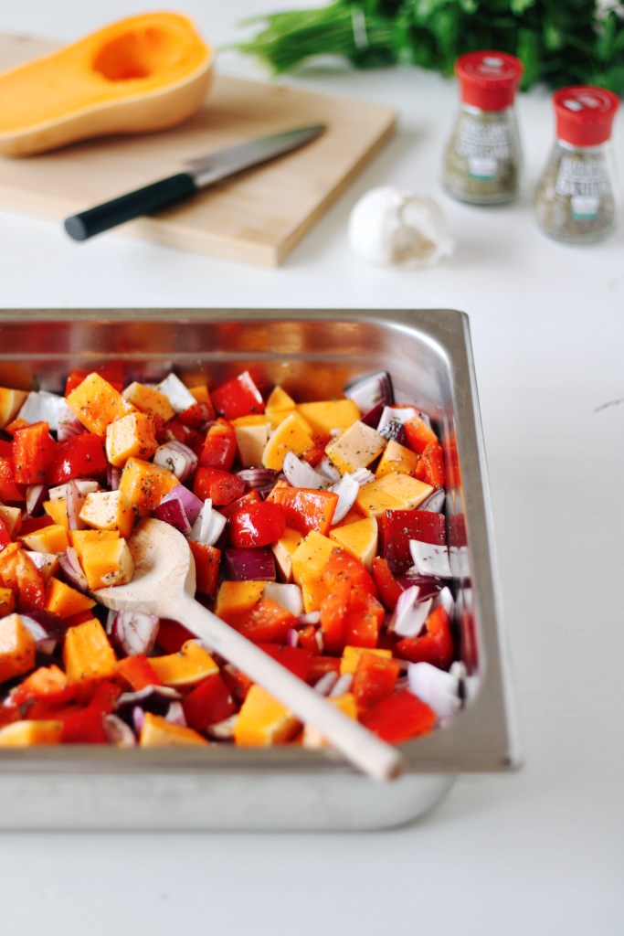 - snij de butternut en paprika in blokjes en de ui in partjes