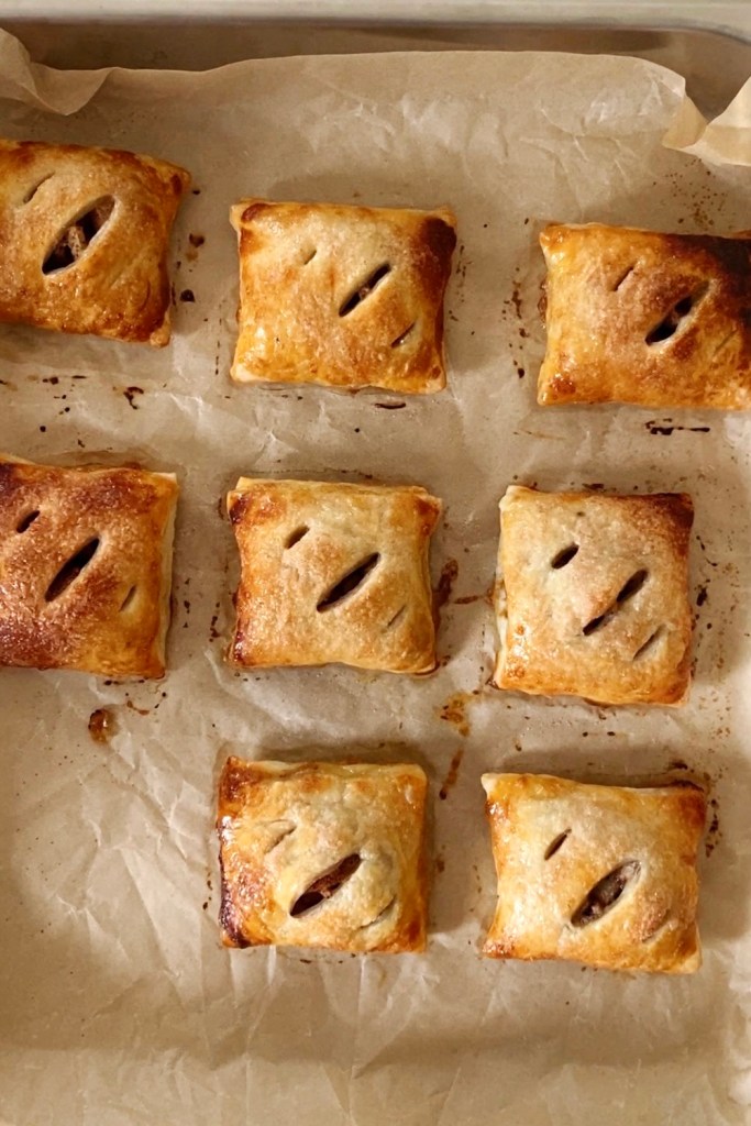 - maak 3 inkepingen in het bovenste stuk bladerdeeg, vouw toe en druk de kanten goed aan